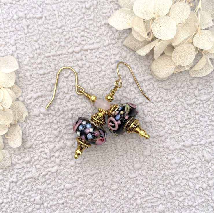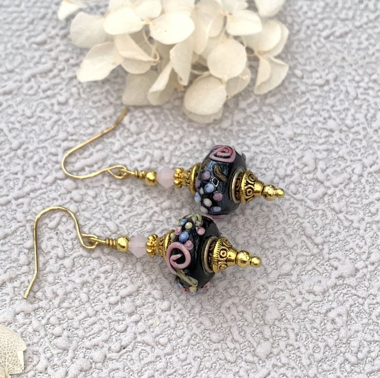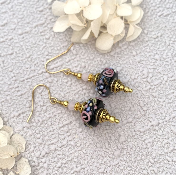 These delicate vintage inspired earrings are made with handmade glass lampwork beads that have pretty floral patterns embossed around the beads. The main colour of the glass beads is black and they have pink rose patterns and blue flowers running round the beads.