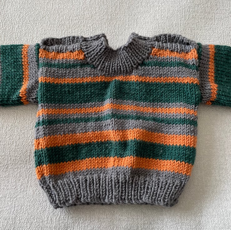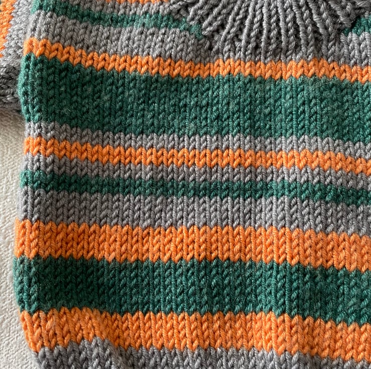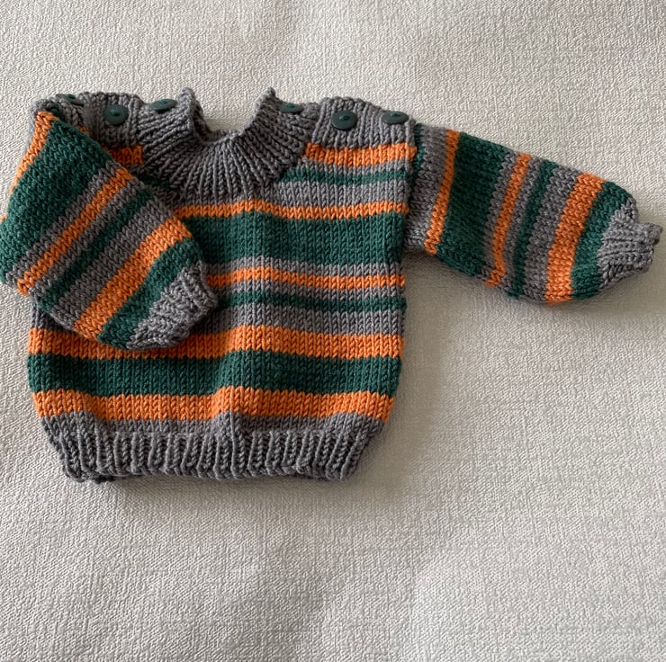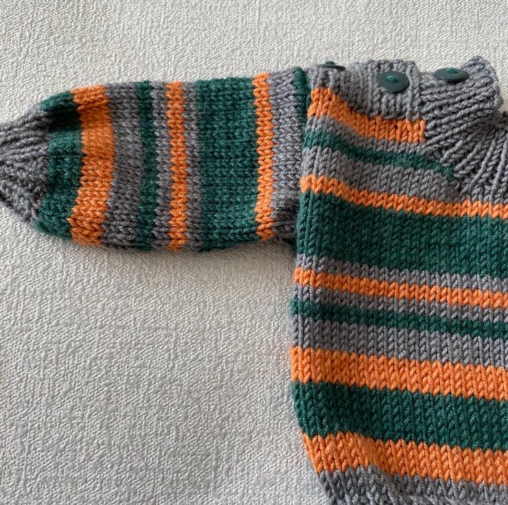 The stripes are of various depths of grey, orange and green yarn. It fastens on both shoulders with three green buttons, making it easy to put on.