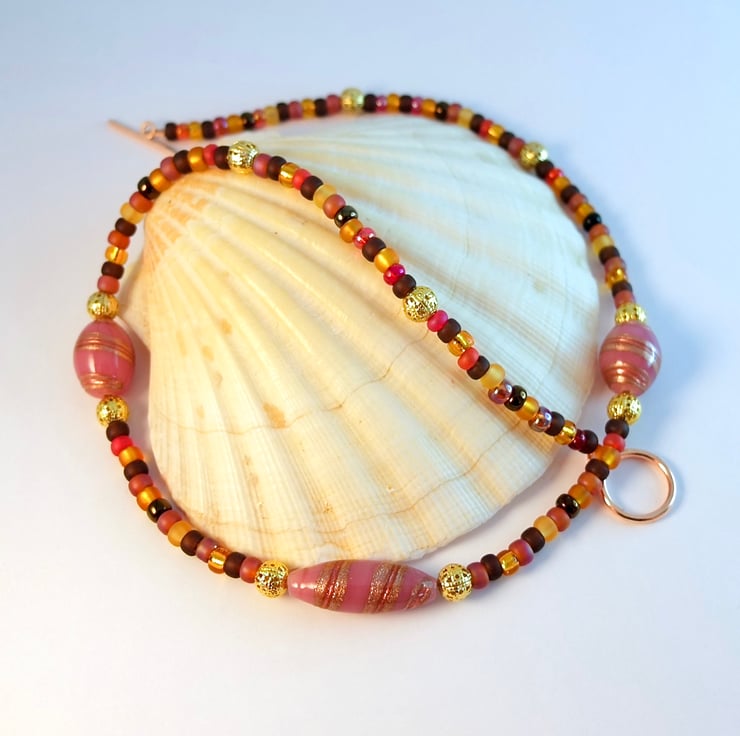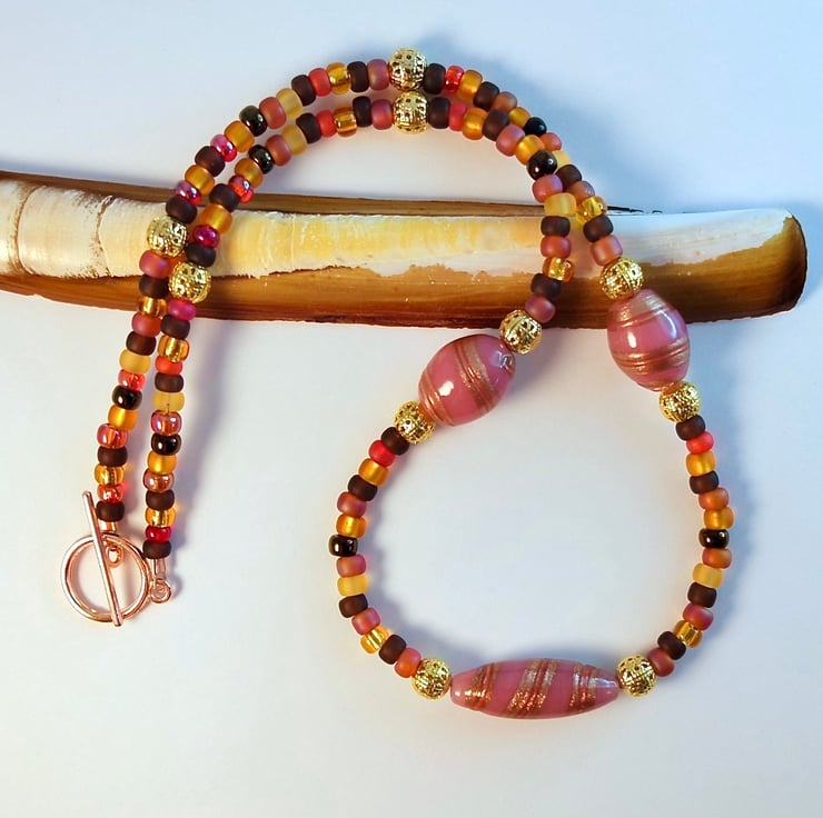 These focal beads are highlighted with 6mm gold plated filigree beads, and set amongst 4mm glass seed beads in shades of yellow, amber, pink and brown.