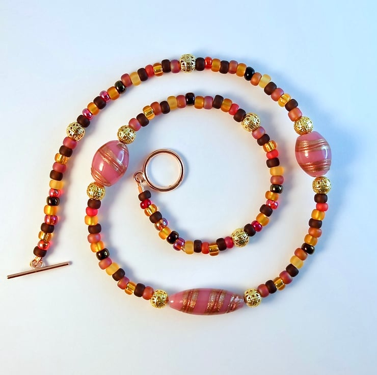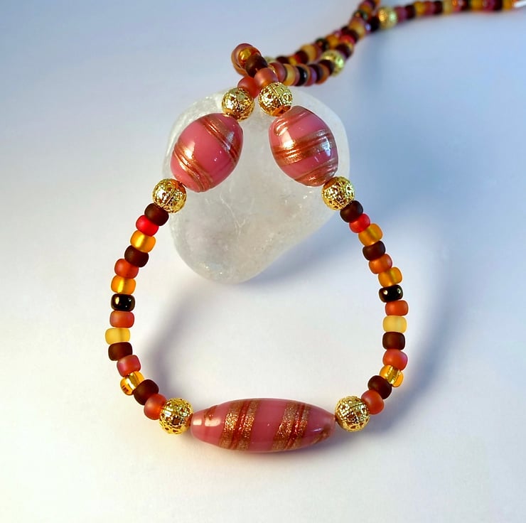 The central bead is a handmade lampwork glass oval measuring 25x10mm in a dusky pink colour with swirls of sparkly gold and dark red, and a matching chunkier 15x10mm oval is placed to either side.