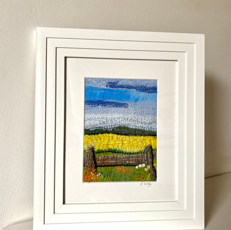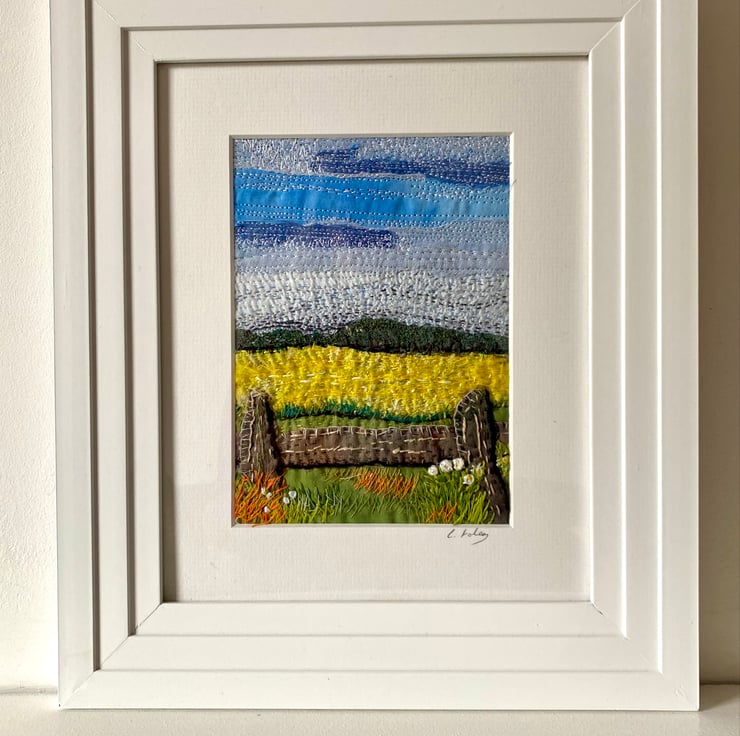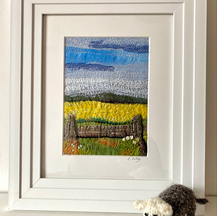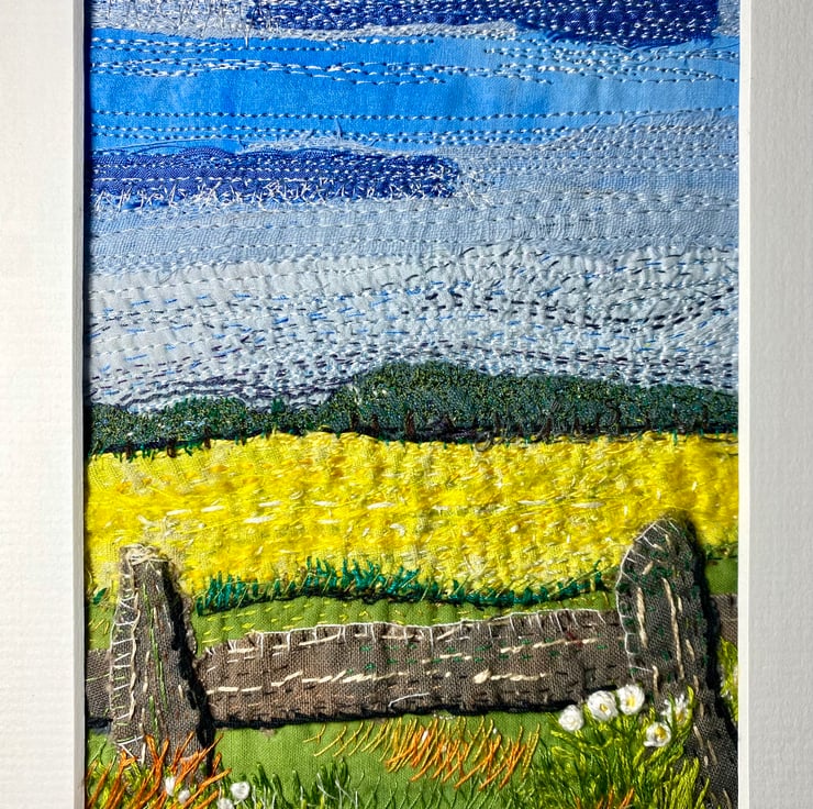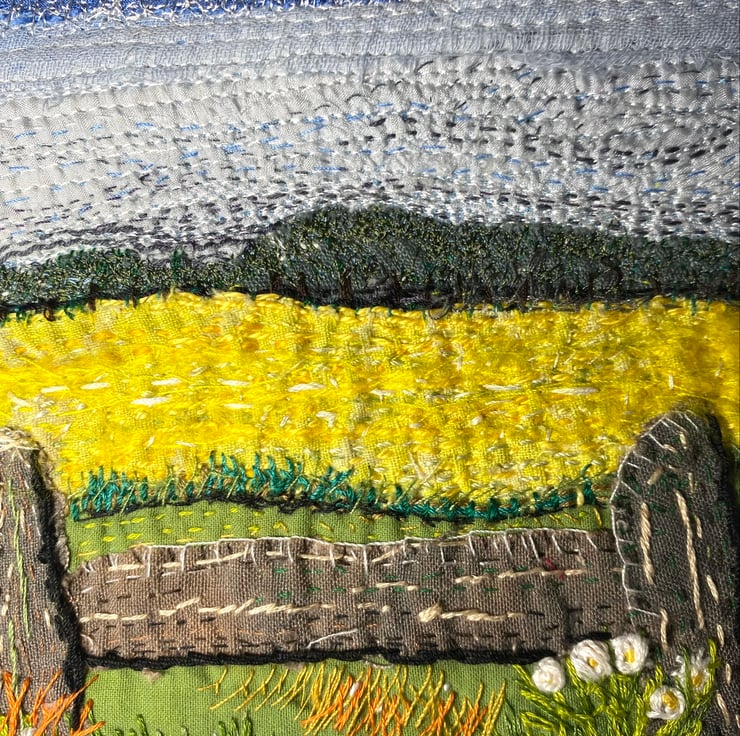 The fabric collage is made using preloved fabrics, most of the stitching is done by hand. There is a small amount of free motion machine embroidery.