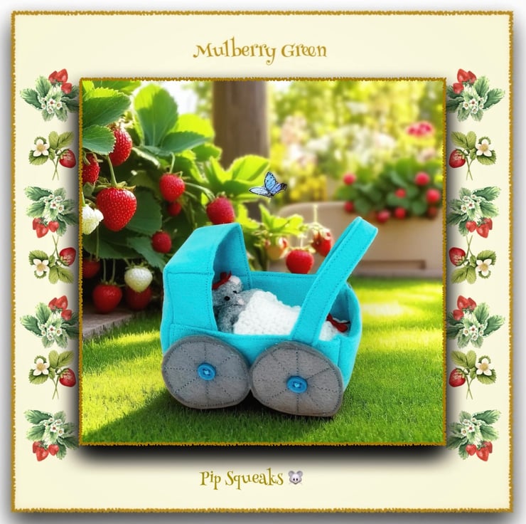 A tiny felt pram for the baby Pip Squeaks. The pram is made entirely from felt and has wheels that don’t turn. It’s the perfect size for the baby Pip Squeaks and has a tiny floral felt mattress