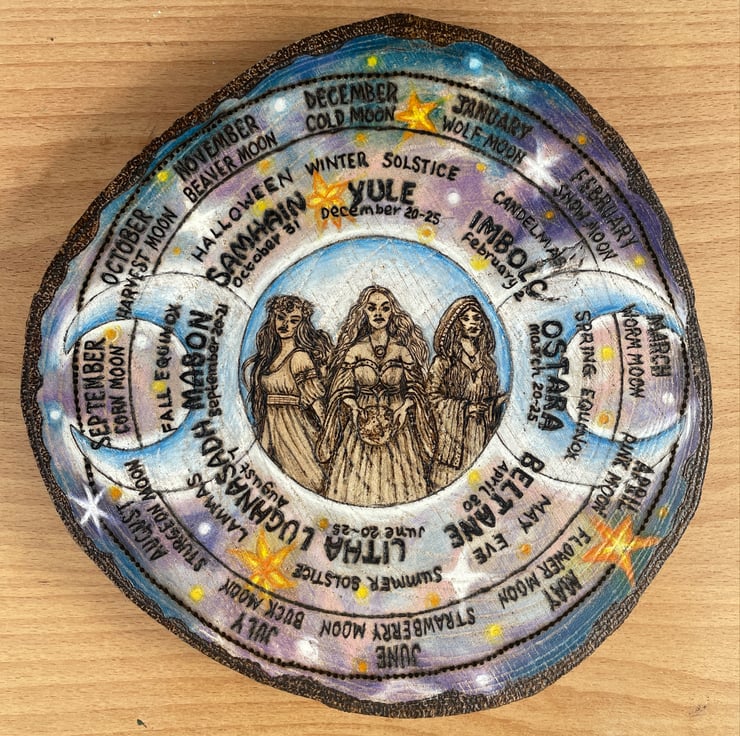 A pyrography/ wood-burned Wheel of The Year with a Triple-Goddess (mother, maiden, crone) centre and bark-effect wood-burned edges.