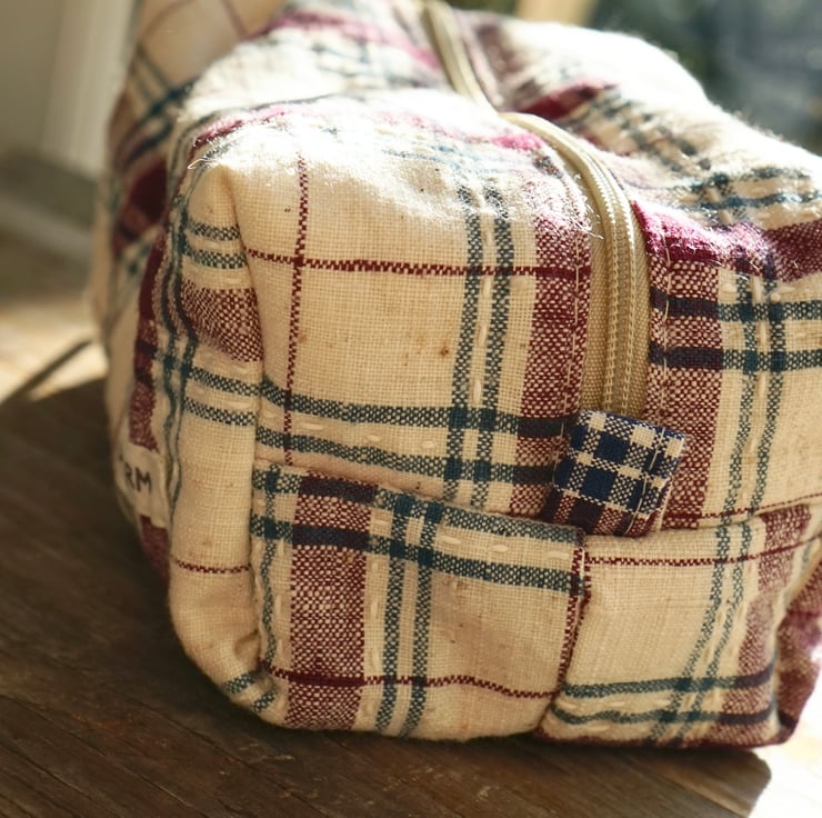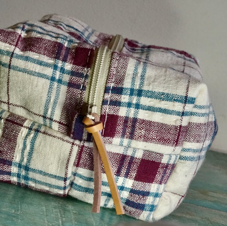 This boxy zipper pouch is a functional, unisex toiletry bag made for travel. Handmade with vintage handwoven cotton, it's full of texture and simple charm. The structured shape holds skincare essentials and travel items neatly – perfect for someone who appreciates simple things with care and purpose.