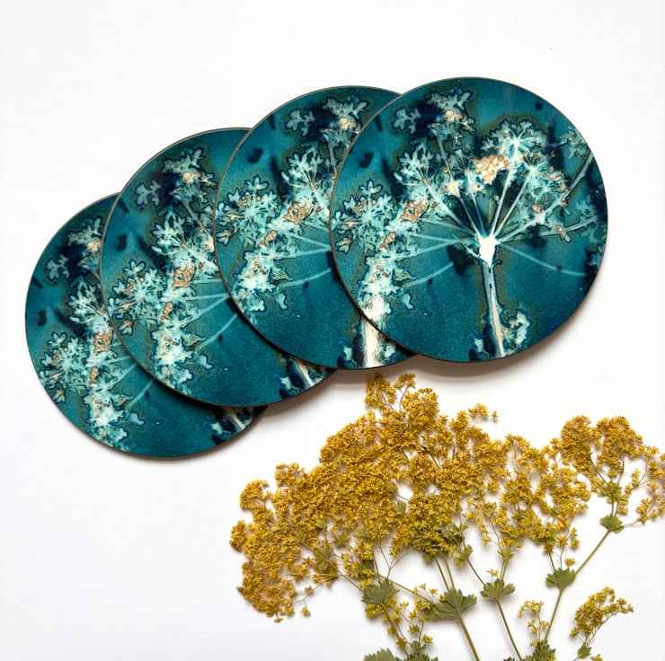 Cyanotype Seed Head Circular Coaster Set x4 (dark wood finish)