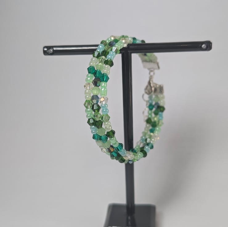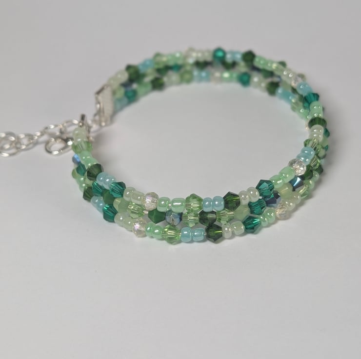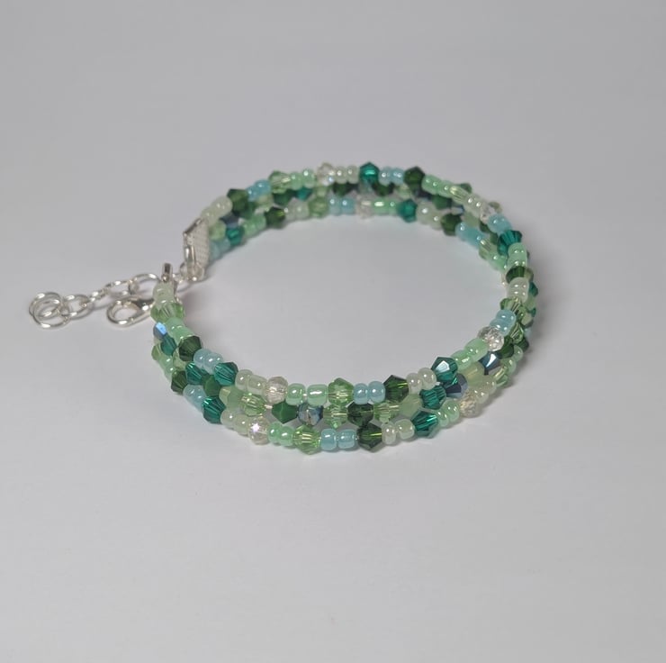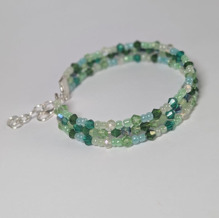 This crystal beaded bracelet is made with a mix of different shades of bicone beads and seed beads, silver memory wire and findings in 3 layers. A simple but elegant little piece of jewellery suitable for any occasion.