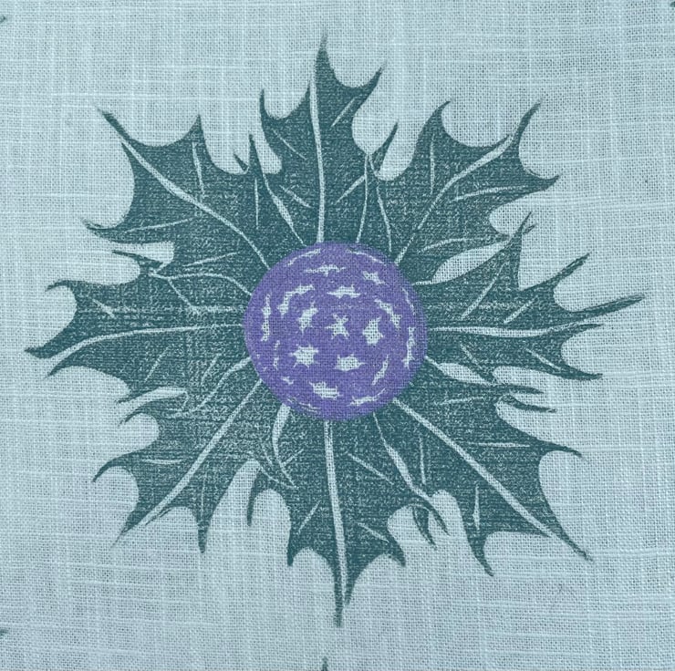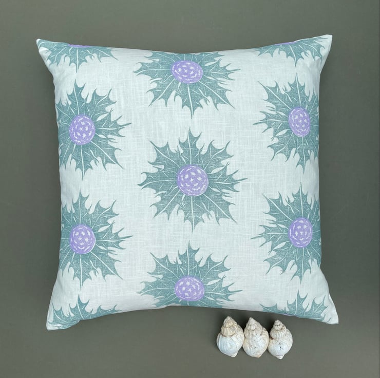 A beautiful handprinted cushion using one of my original designs of sea holly.