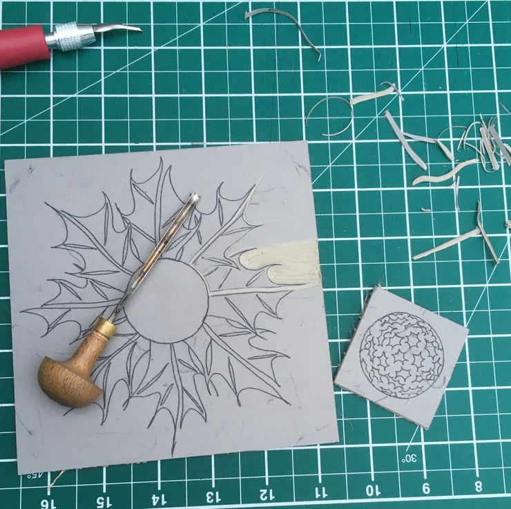 The fabric is printed from hand carved lino in green and purple onto ivory linen.