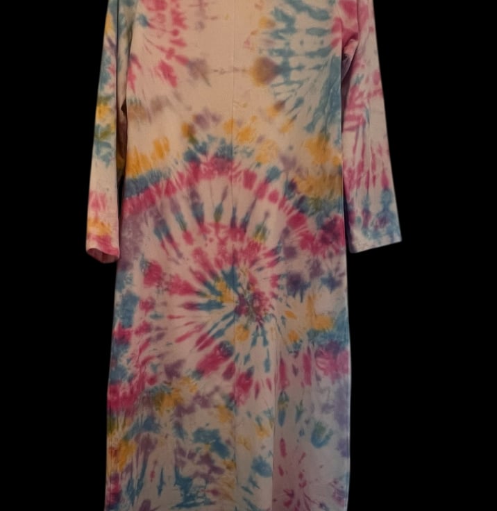 Step into effortless style and sustainable fashion with this one-of-a-kind, upcycled maxi dress. Hand tie-dyed in a vibrant, multicoloured pattern, no two pieces are ever the same – making this a truly unique wardrobe treasure.