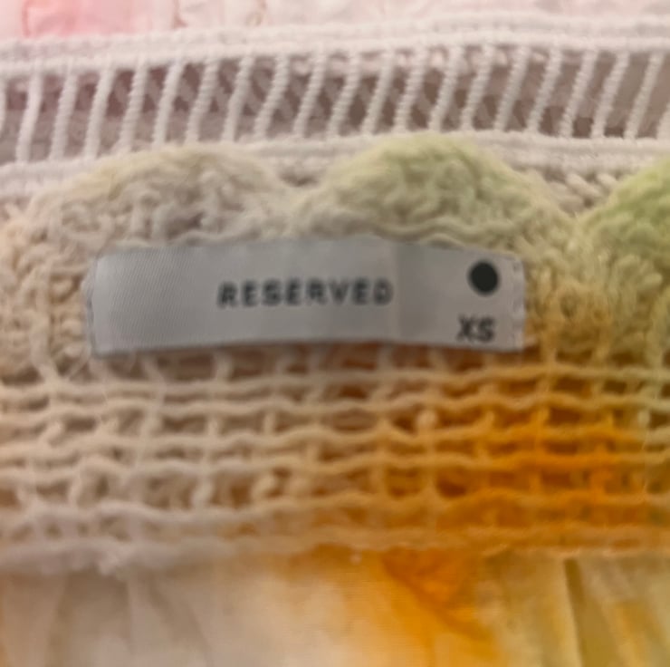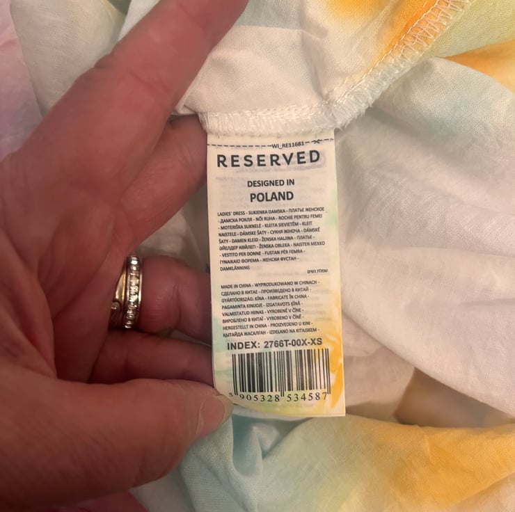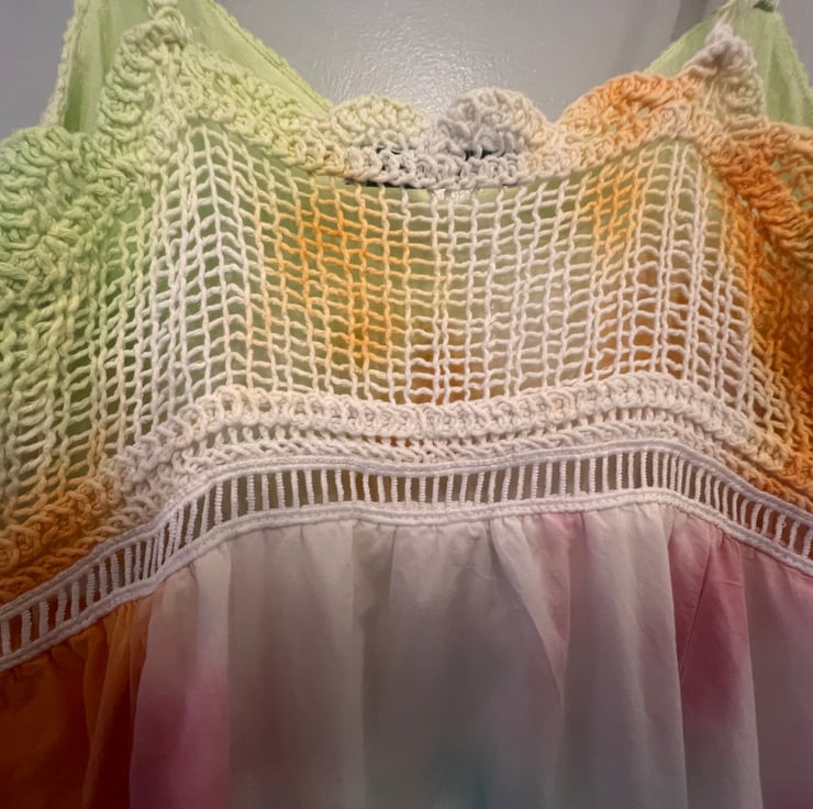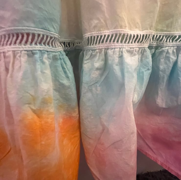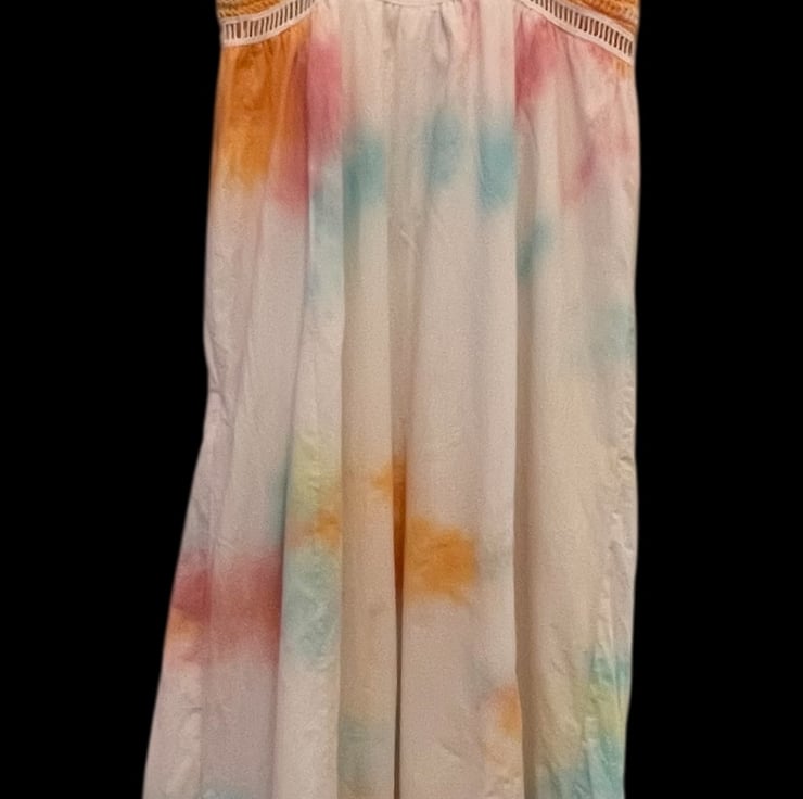 This dress is a size small and features a maxi length and a gently flared A-line cut. The colours are bold and eye-catching, dyed by hand to ensure every piece has its own distinct look.