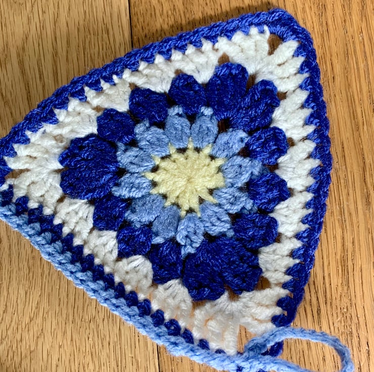 Each triangle is made in acrylic yarn using a 3mm hook. The granny triangles are joined with a single crochet chain and hanging loop at each end.