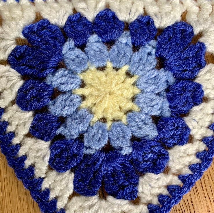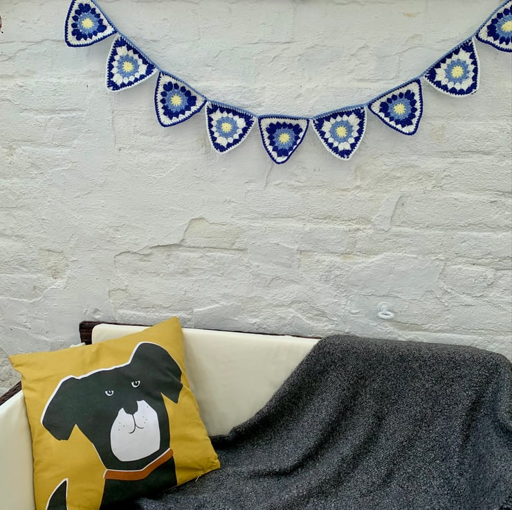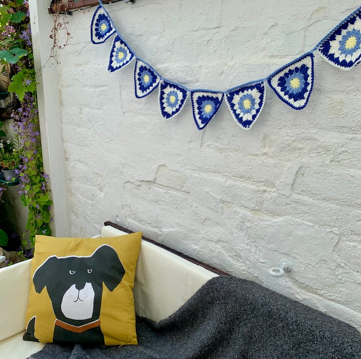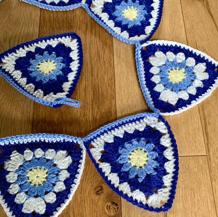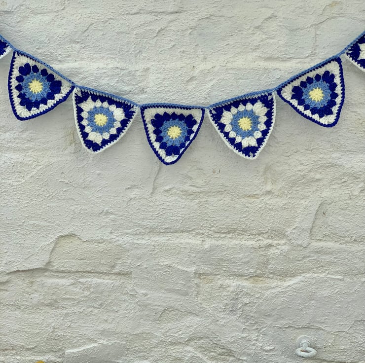 Forget-me-not crochet bunting. This blue and white handmade bunting consists of 9 crochet granny triangles joined with a single crochet chain. Ideal for a garden or patio decoration or to accessorise a conservatory or summer house. The blue and white would also go with a coastal theme.