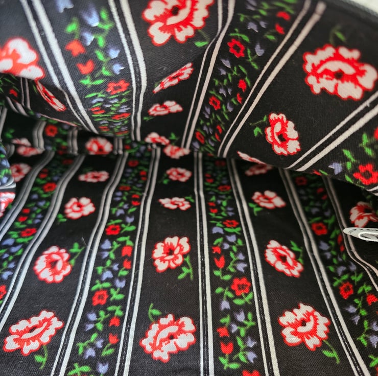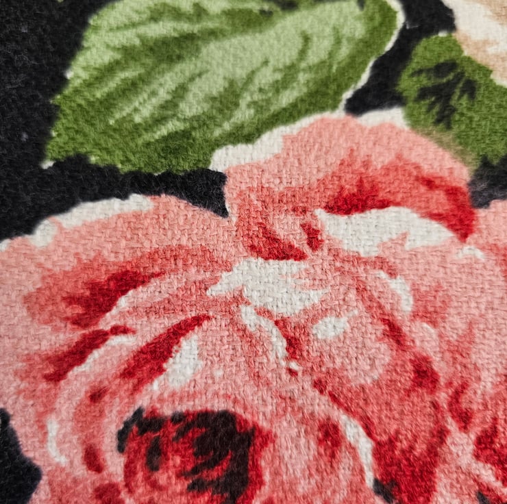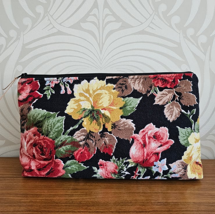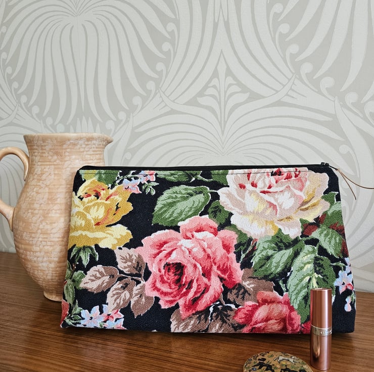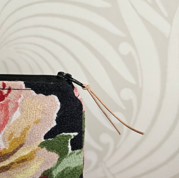 Floral clutch bag/zip pouch made with vintage barkcloth fabric and lined with a coordinating floral cotton fabric. Finished off with a leather zip pull. There is a layer of interfacing to give the bag a bit of body. The base is boxed to give the bag some volume.