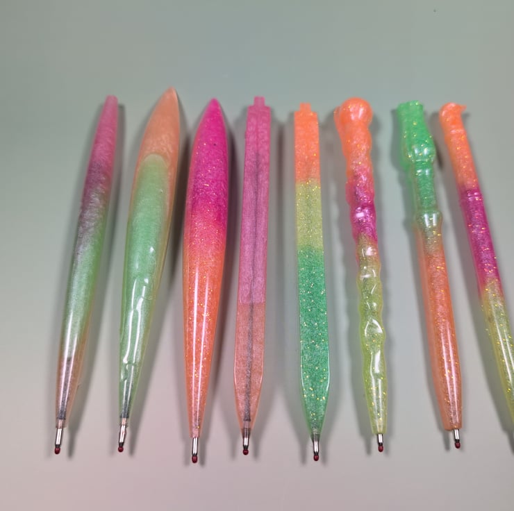 These vibrant resin pens are cast in vivid neon colours that glow under UV light. Each one features a smooth, comfortable shape with a glossy finish. Designed for anyone who loves colour and energy, these pens are especially popular as gifts for students, teachers, artists, and fans of retro aesthetics.