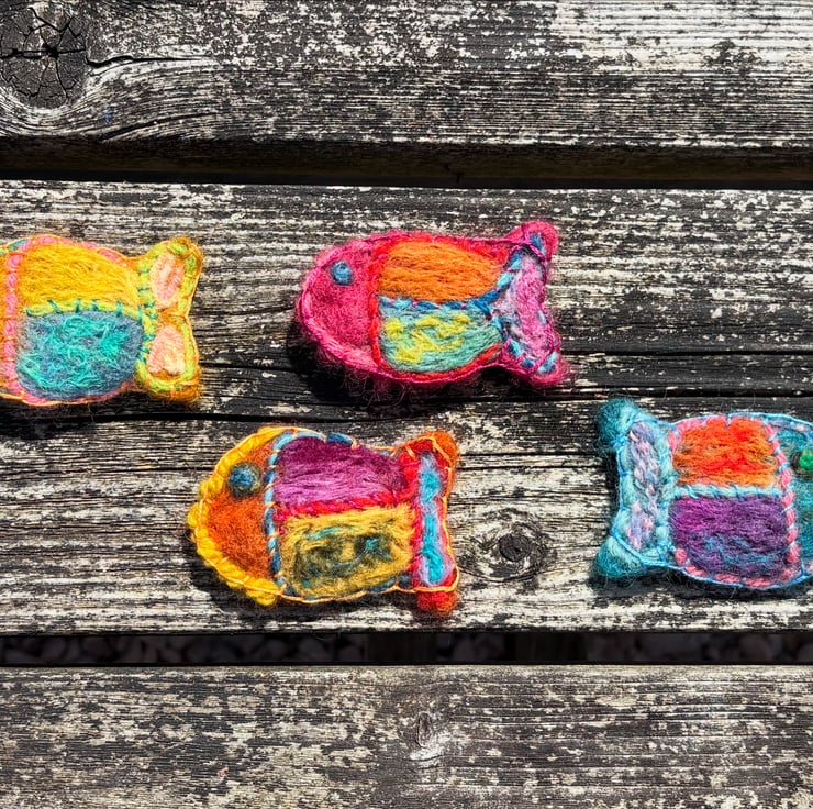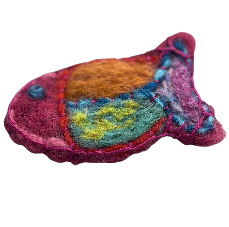 The brooch is created from a needle felt and embroidered fish motif, backed by wool felt with a pin added.