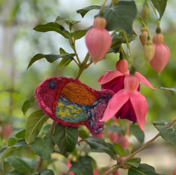 This piece is created by needle felting wool fibre and yarn into a plain motif. I then use yarn and embroidery to add colour, pattern and detail to the shape.