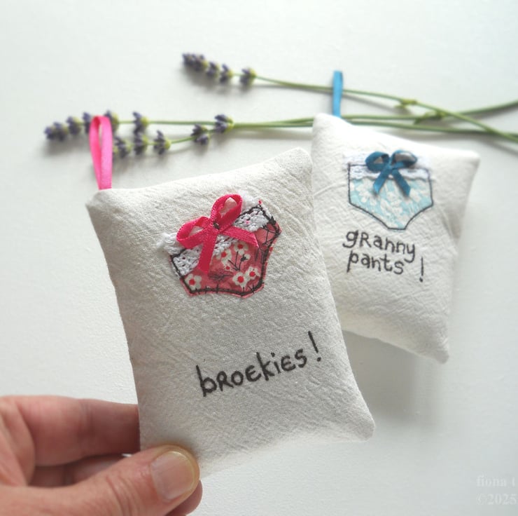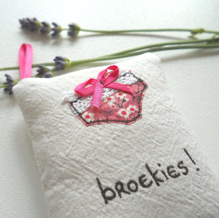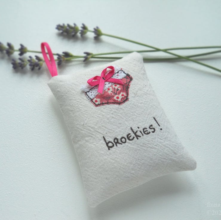 free motion embroidered "broekies!" lavender bag to keep your knicker drawer lovely 'n fragrant. the perfect gift for south african meisies. only 1 available - the item in the photos is the one you will receive.