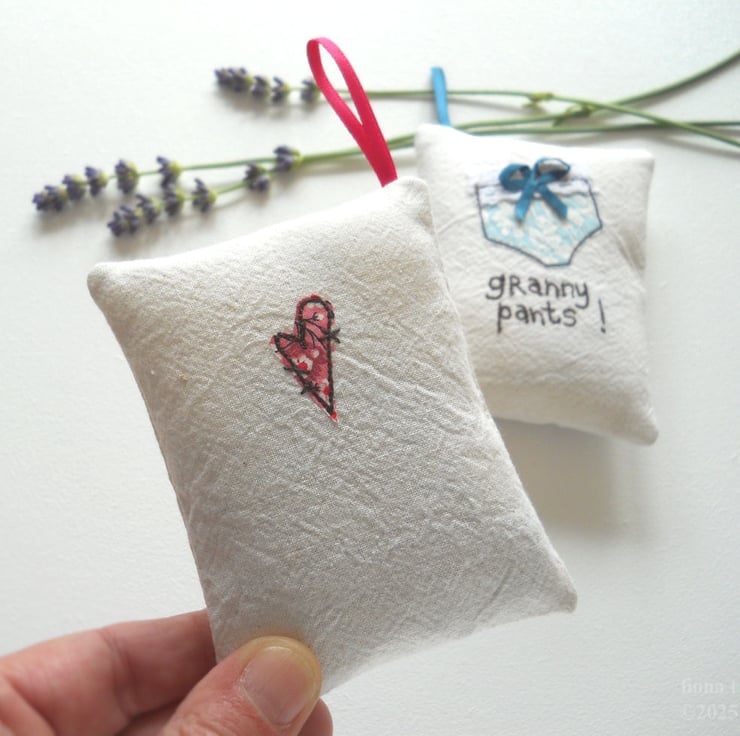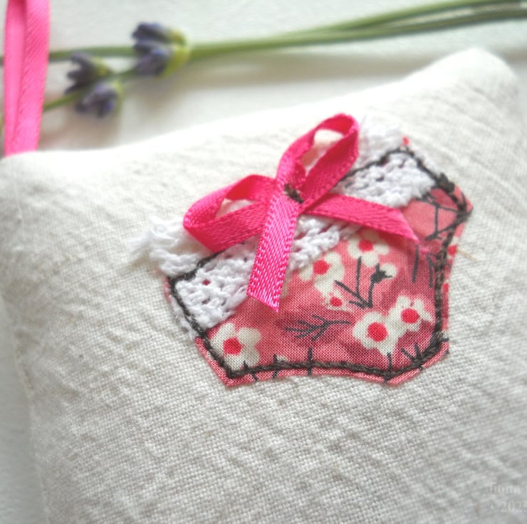 measuring 10x8cm (4x3"), this little hanging sachet features a pair of liberty print fabric undies on thick cotton calico base fabric. the appliqued pants are free machine embroidered and embellished with lace and a tiny ribbon bow.