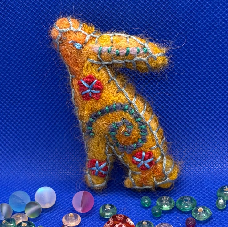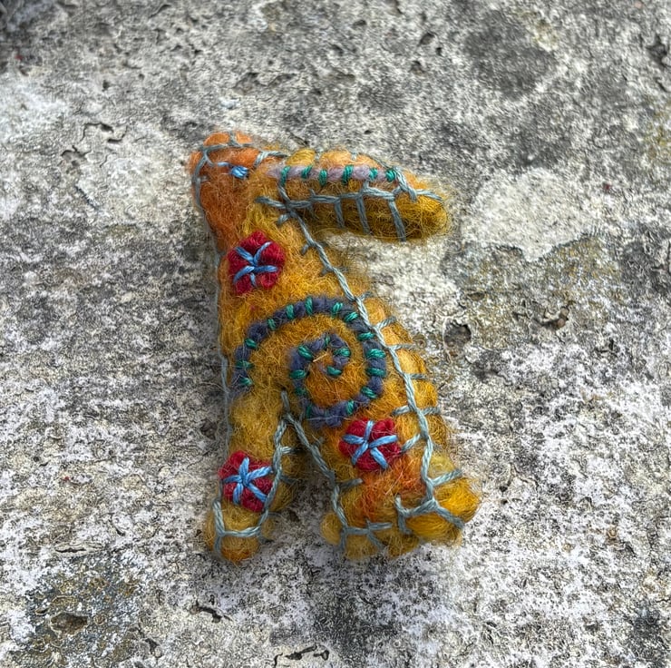 The brooch is created from a needle felt and embroidered motif, backed by felted wool with a pin added.