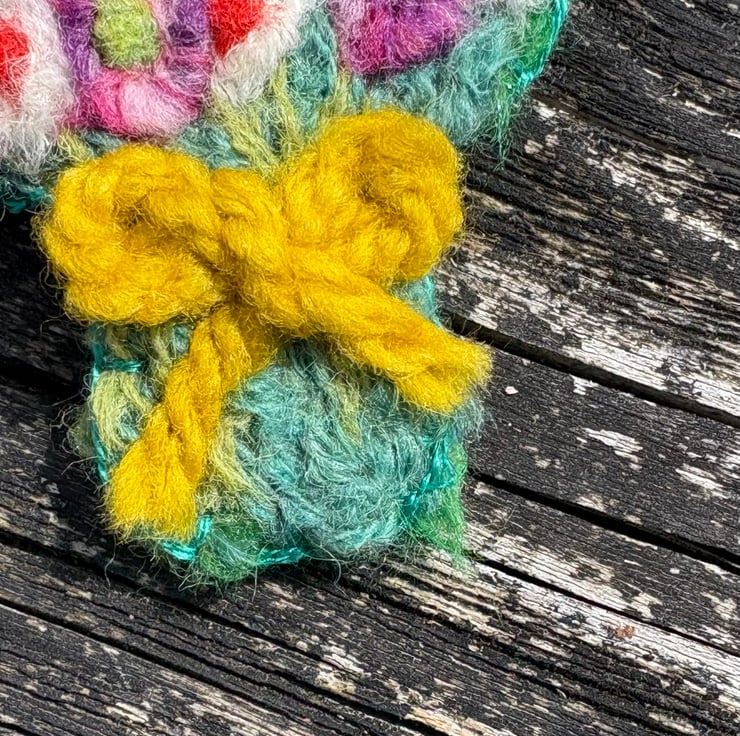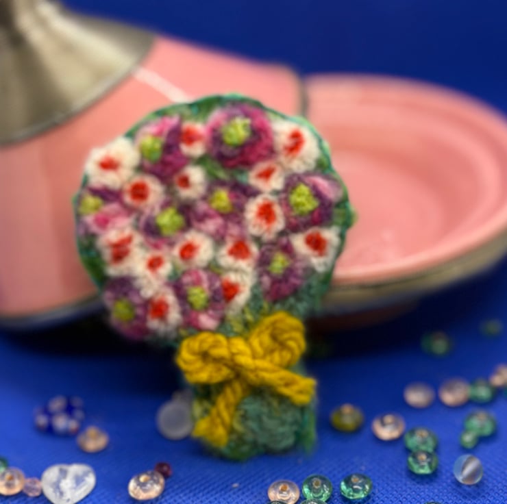The brooch is created from a needle felt and embroidered motif, backed by wool felt with a pin added.
