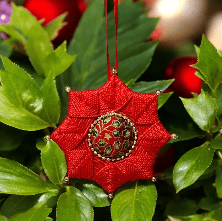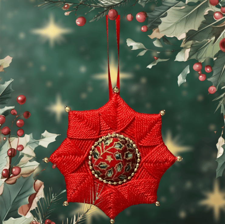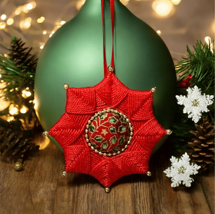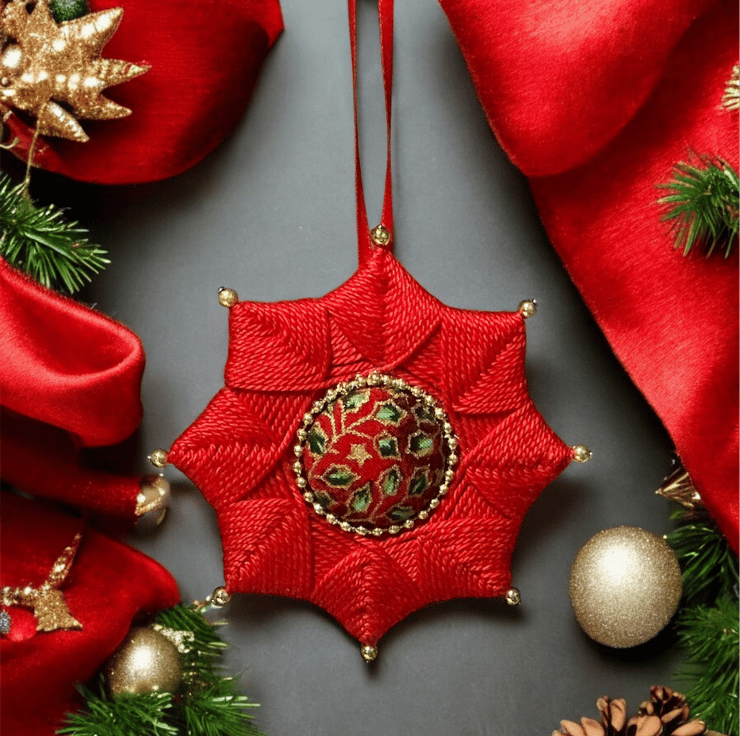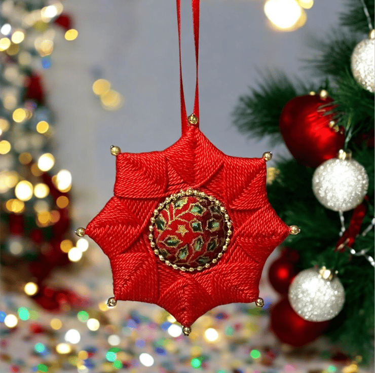 These charming Christmas tree decorations are lovingly handmade using cotton yarn wrapped around a cardboard star shape. The back is neatly finished with a matching felt piece, ensuring a polished look from every angle.