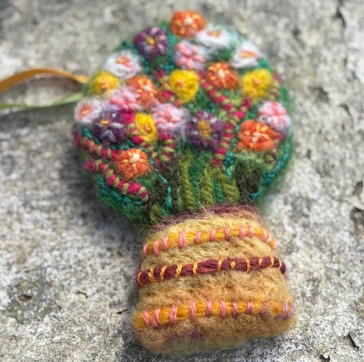 The hanging ornament is created from a needle felt and embroidered motif with an added metal hanging loop and silk ribbon.