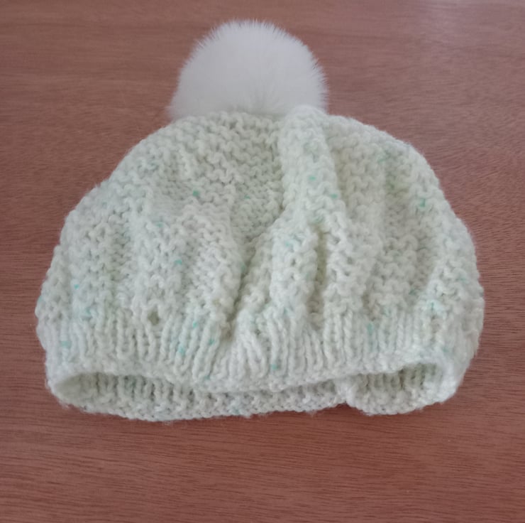 this is a hand knitted textured patterned hat with a detachable faux fur bobble to keep your little one warm and cosy on chilly days. the hat measures 14 inches at the widest part. Tthis can be made in other colours and sizes. please message me for details.