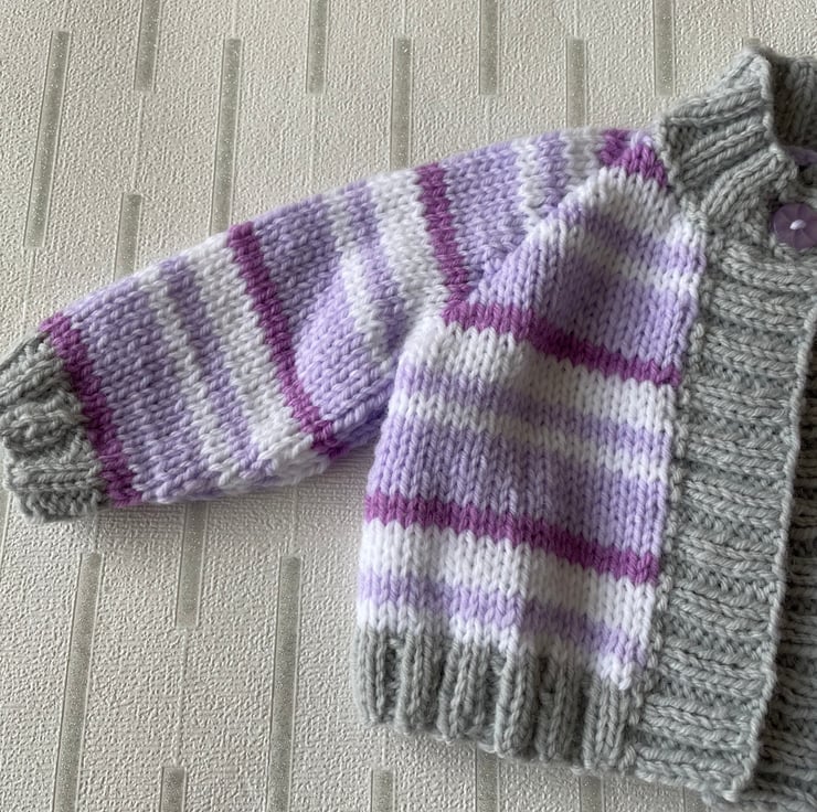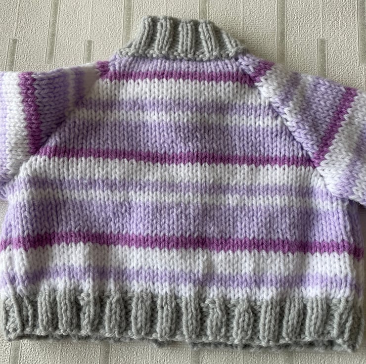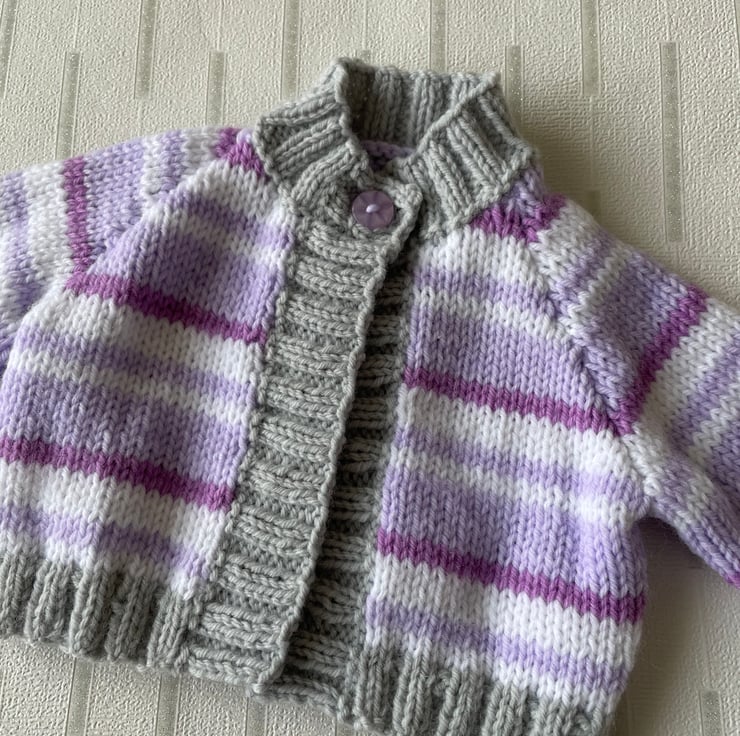 This tiny cardigan is hand knitted in a soft baby yarn.