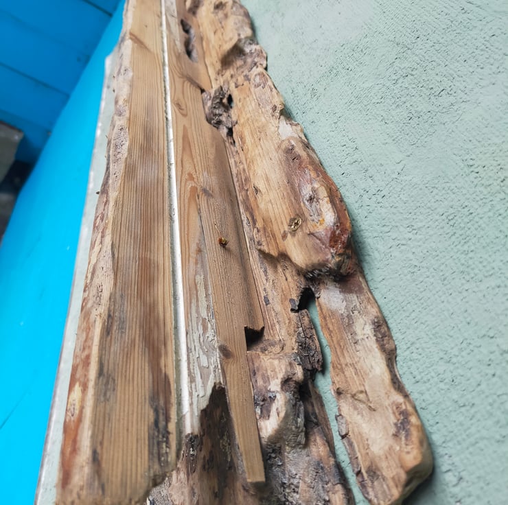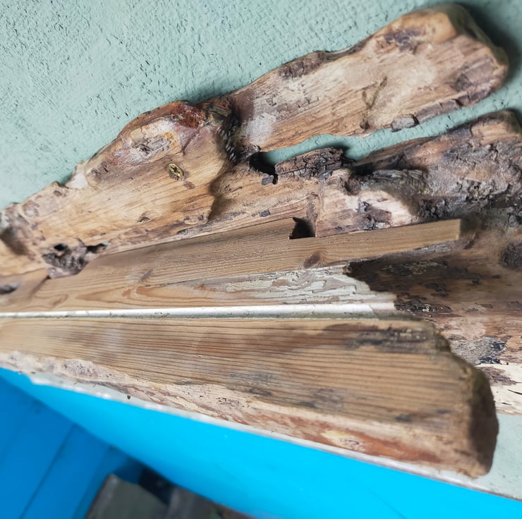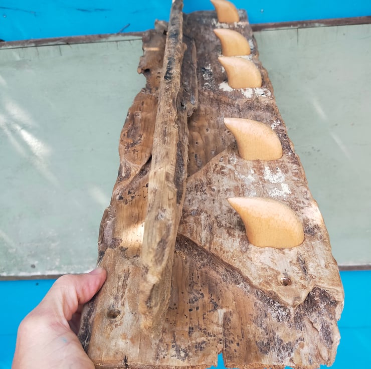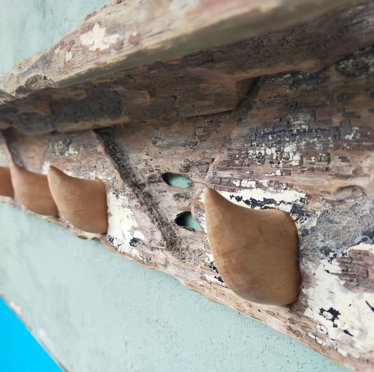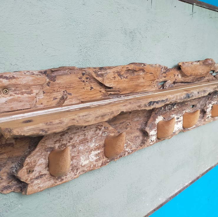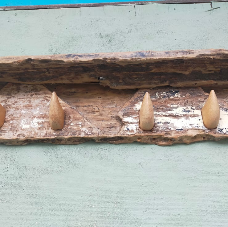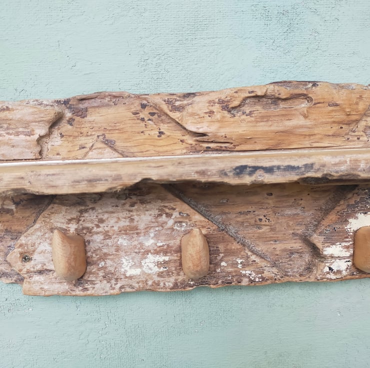 To me, this is the ugliest but most characterful of my coat racks. I decided to embed five simple oak claws so as not to detract from the story the timber has to tell. The backboard, still retaining some of its white paint, was clearly a very elaborate piece of decorative frieze, possibly from a public building or pub, with some kind of zigzag pattern cut into it. The shelf also retains paint in a groove cut into it. For me it's the piece most evocative of the buildings lost in the war.