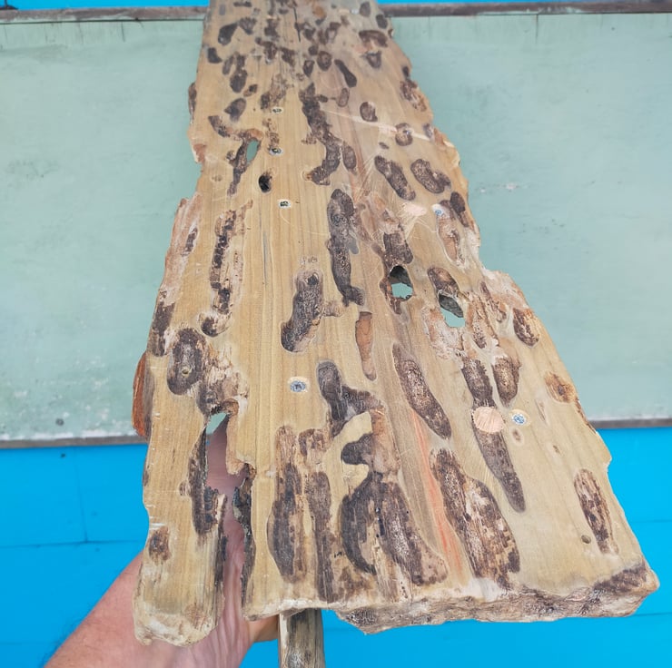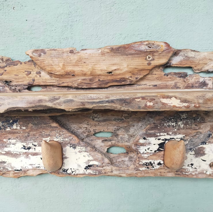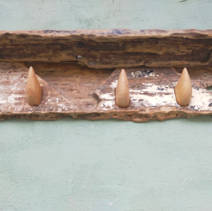 Just to the north of Anthony Gormley's sculptures on Crosby beach is the Brick Beach. Here, the rubble of the Blitz on Liverpool was deposited to act as a defence against coastal erosion. For many years I have walked that beach, picking up curiously gnarled pieces of timber. At first I thought they were driftwood, etched into sculptural shapes by the sea, but I came to realise that they were being revealed by the wind and sea from the war rubble I was walking on. It dawned on me that these weren't just bits of wood, these wormeaten pieces of door frame and floorboard, some showing the marks of fire, were part of the history of my home town. I decided to give these beautiful historical remnants of the bombed homes of past Liverpudlians a new lease of life as coat racks. Each has been dried, cleaned up (but not too much), planed flat at the back, treated with preservative, and fitted with hardwood hooks.