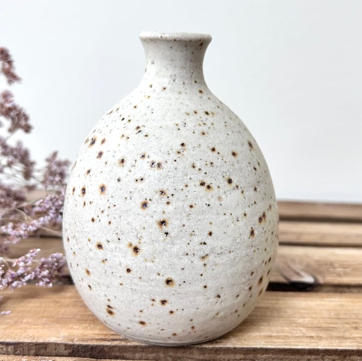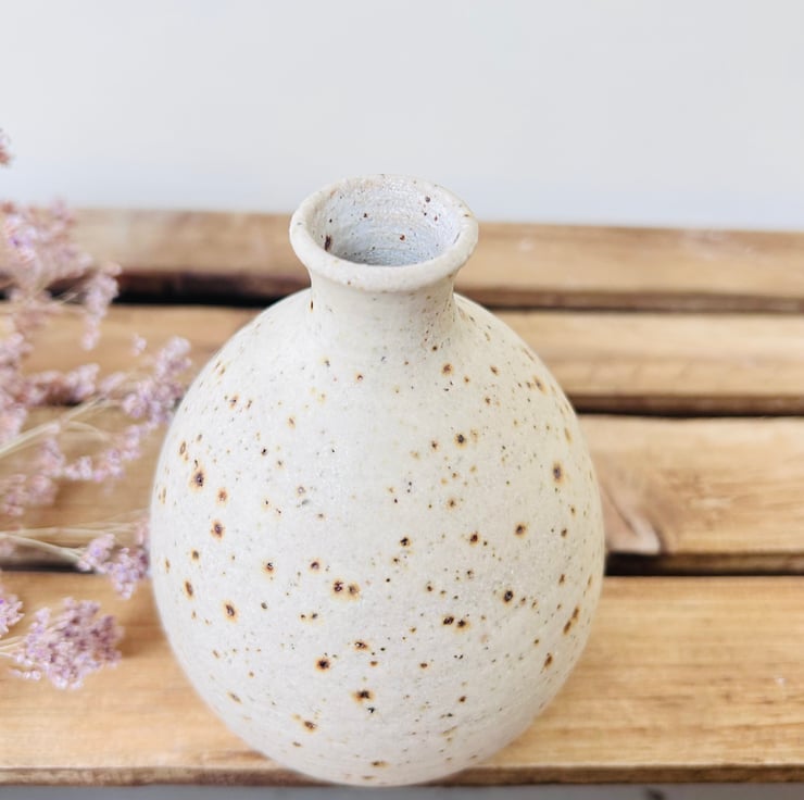 A small hand thrown vase finished with a lovely matt oatmeal glaze. The vase is made using a speckled Clay which you can see comes through the glaze beautifully.