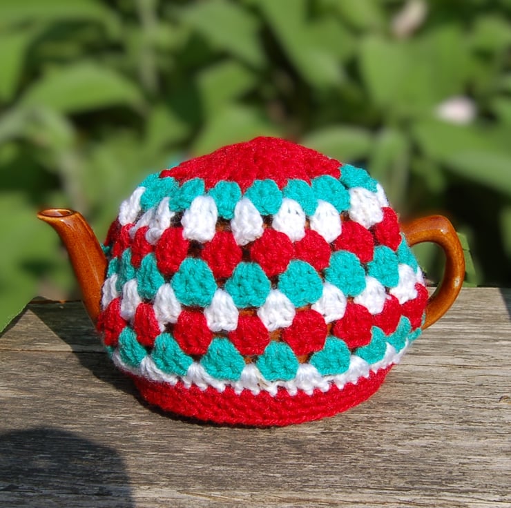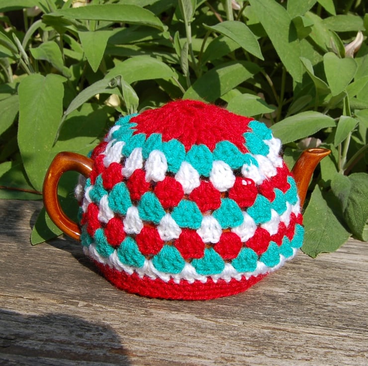 A lovely colourful crochet tea cosy for a small tea for one teapot. I've crocheted it using left over acrylic yarn from other projects using a traditional granny stitch design. It's a great way to use all those small balls of yarn and save them from landfill.