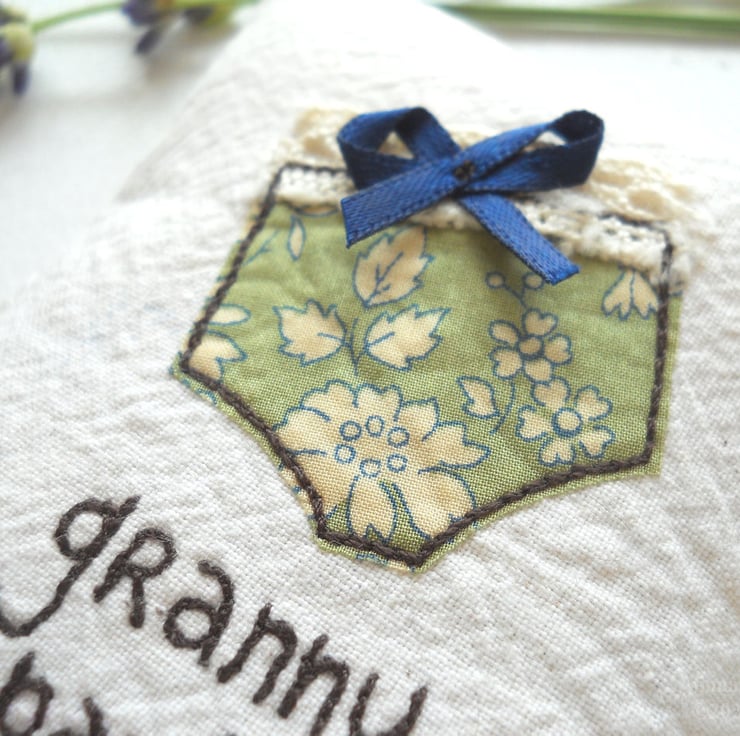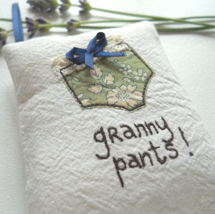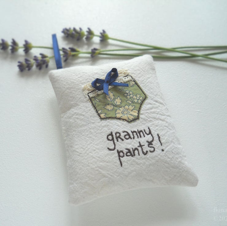 free motion embroidered "granny pants!" lavender bag to keep your intimates drawer lovely 'n fragrant. only 1 available - the one you'll receive is the one pictured.