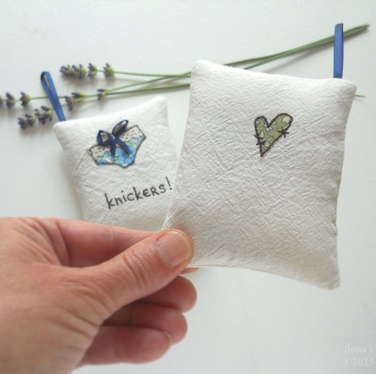 measuring 10x8cm (4x3"), this little hanging sachet features a pair of liberty print fabric comfy undies on thick cotton calico base fabric. the appliqued pants are free machine embroidered and embellished with lace and a tiny ribbon bow.