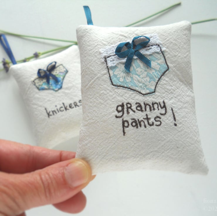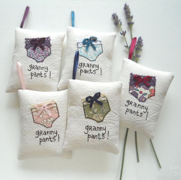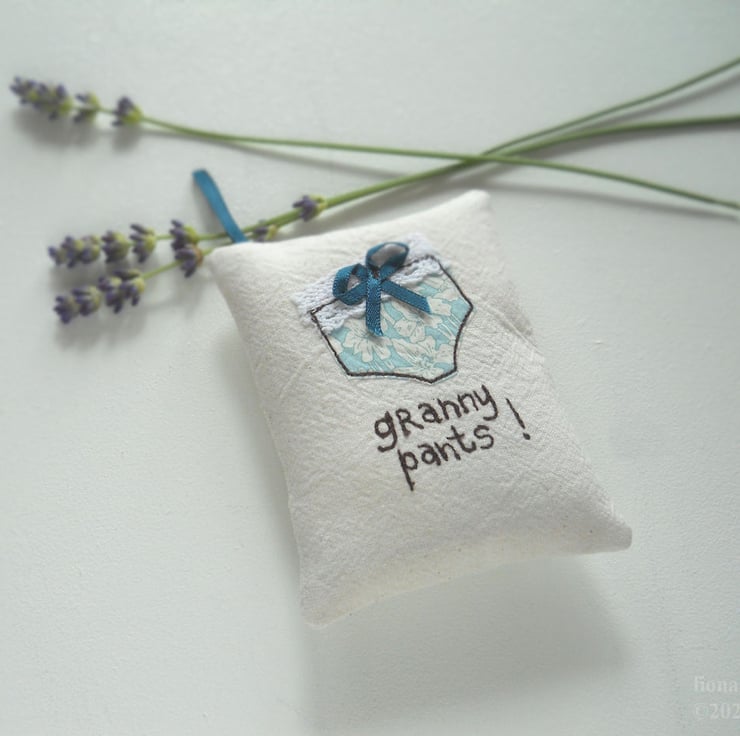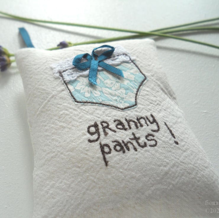 free motion embroidered "granny pants!" lavender bag to keep your intimates drawer lovely 'n fragrant. only 1 available - the one you'll receive is the one pictured.