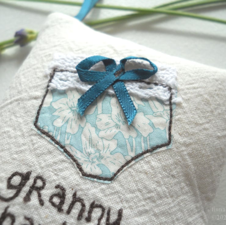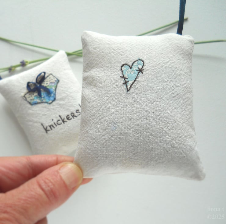 measuring 10x8cm (4x3"), this little hanging sachet features a pair of liberty print fabric comfy undies on thick cotton calico base fabric. the appliqued pants are free machine embroidered and embellished with lace and a tiny ribbon bow.