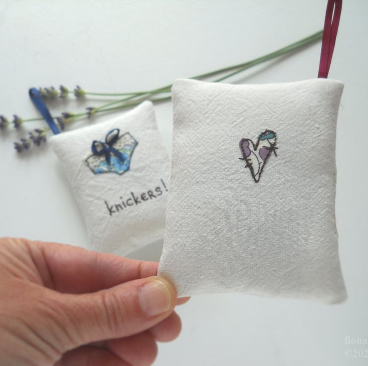 measuring 10x8cm (4x3"), this little hanging sachet features a pair of liberty print fabric comfy undies on thick cotton calico base fabric. the appliqued pants are free machine embroidered and embellished with lace and a tiny ribbon bow.