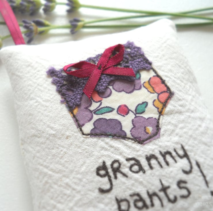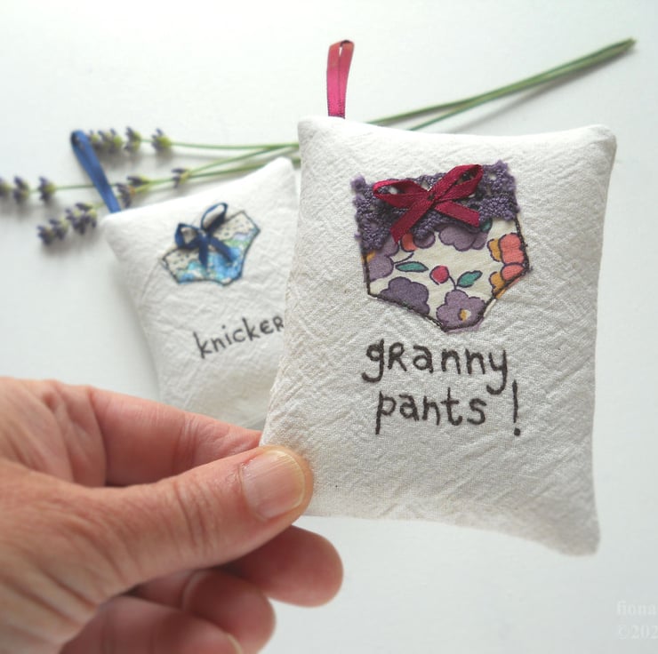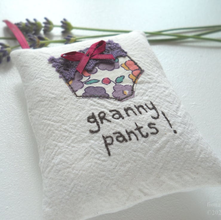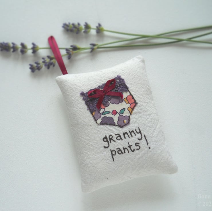 free motion embroidered "granny pants!" lavender bag to keep your intimates drawer lovely 'n fragrant. only 1 available - the one you'll receive is the one pictured.
