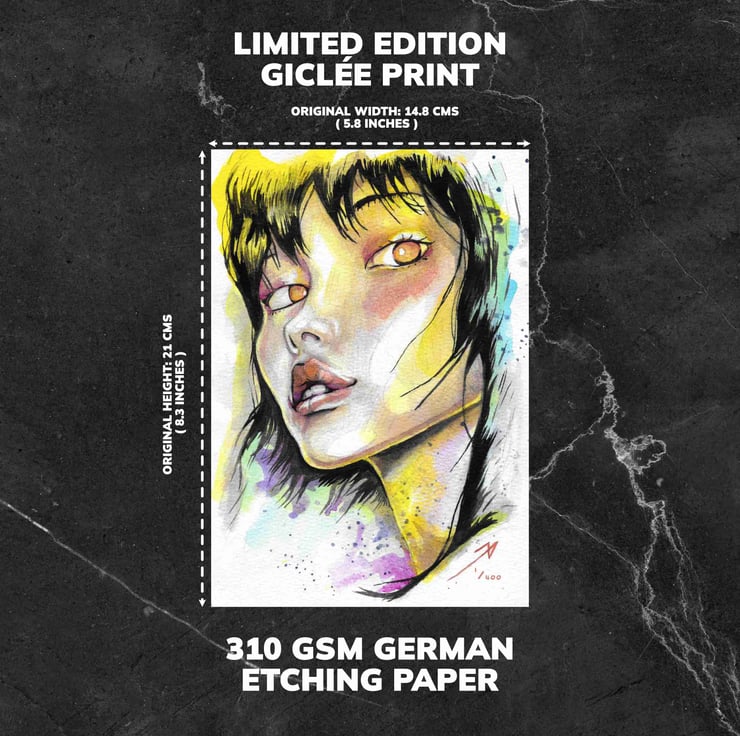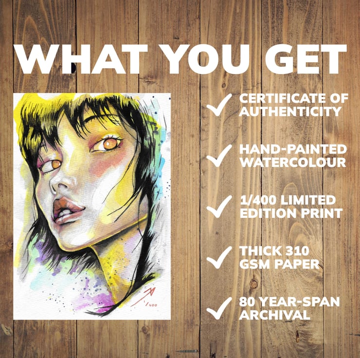 This is the large limited edition print of my watercolour portrait of the Shinto Sun Goddess, Amaterasu. There is a series of 4 watercolour portraits of the Shinto Sun Goddess, Amaterasu. That series is part of a larger work exploring Japanese culture and art.