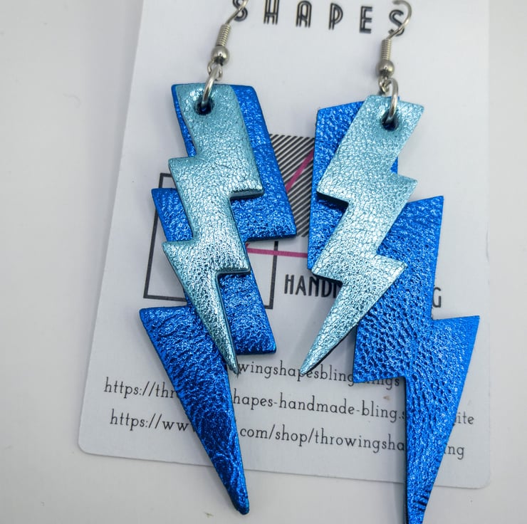 Striking lightening strikes! Layered lightening bolts made with vibrant blues metallic leather. Lightweight statement earrings.