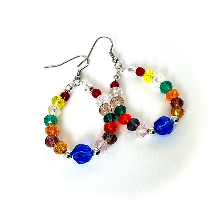 Dangly hoops on stainless steel ear wires with a rainbow burst of colours to suit any outfit.