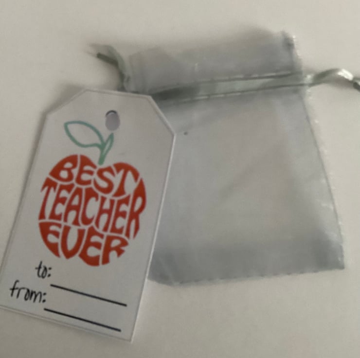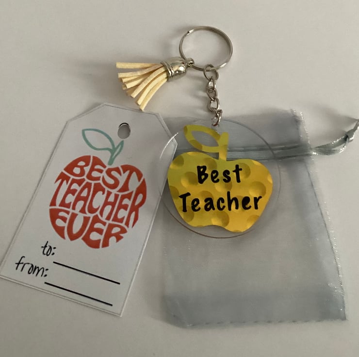 Circle acrylic (5cm) keychain with gold vinyl apple shape and black vinyl ‘Best Teacher’ text.