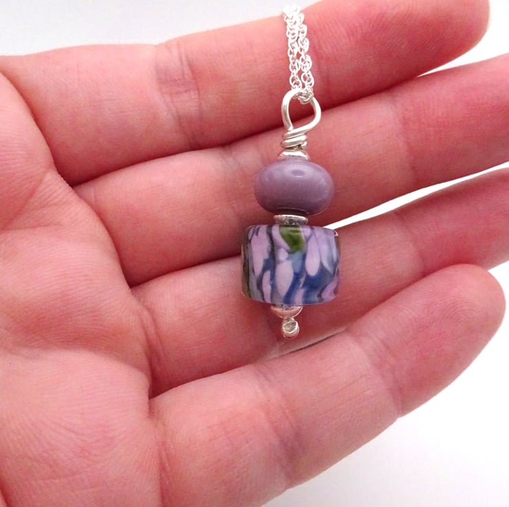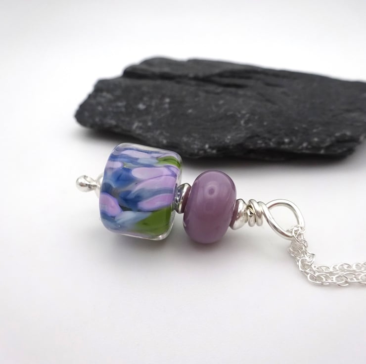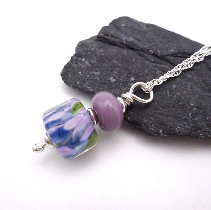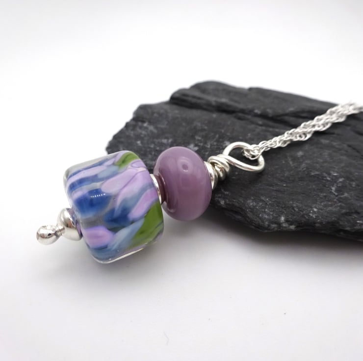 A sterling silver chain which features a handmade lampwork glass pendant made with purple, blue and green glass.