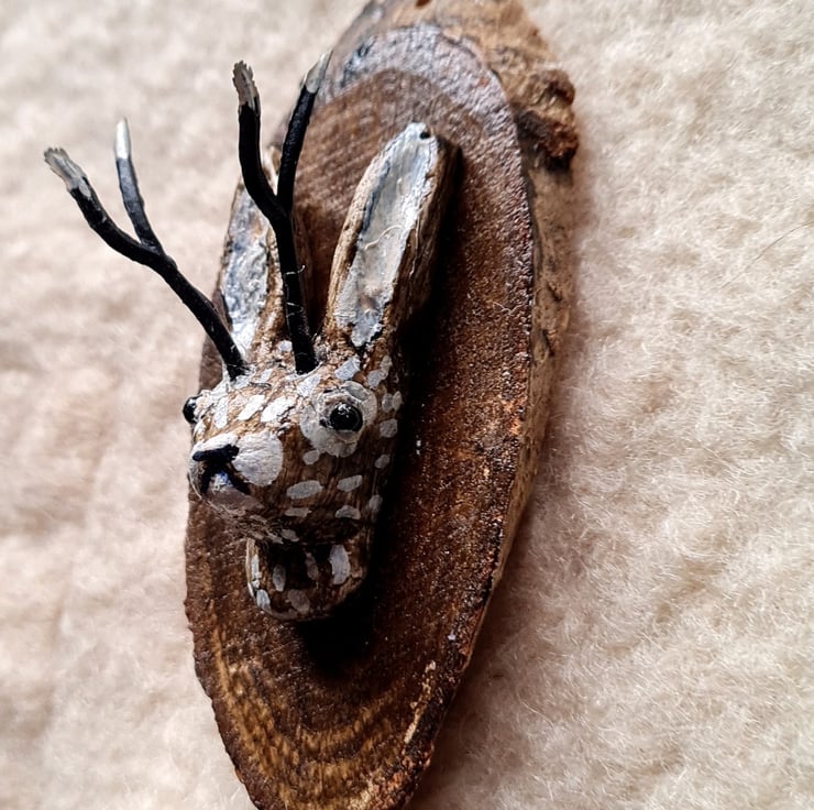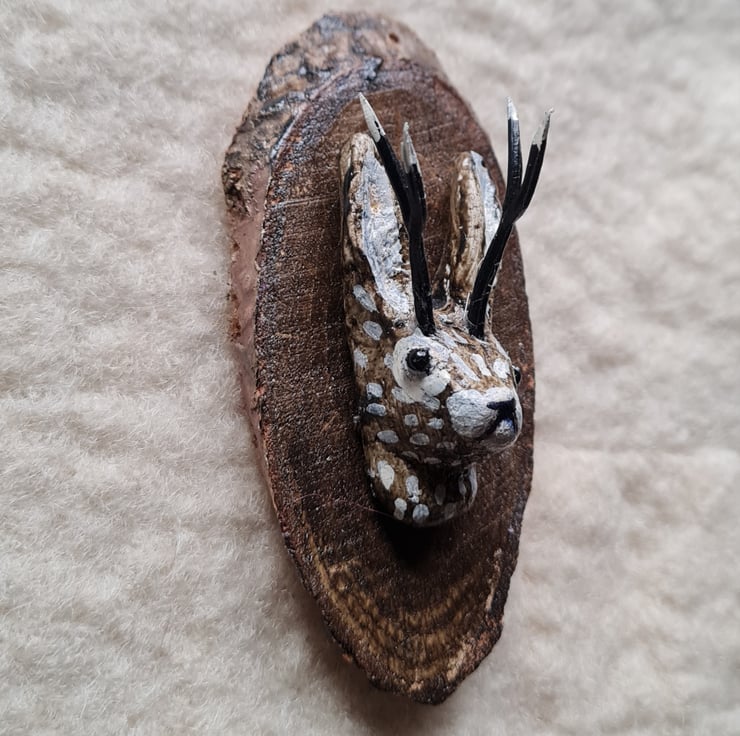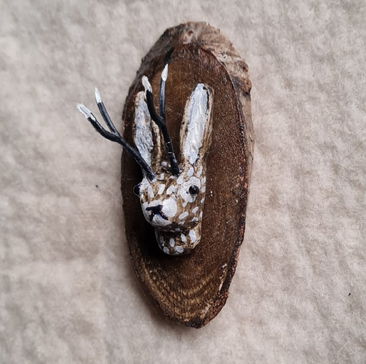 A miniature 2 inch high jackalope which I have cast from air dry clay, then hand painted, varnished and added beads for eyes and acrylic antlers.