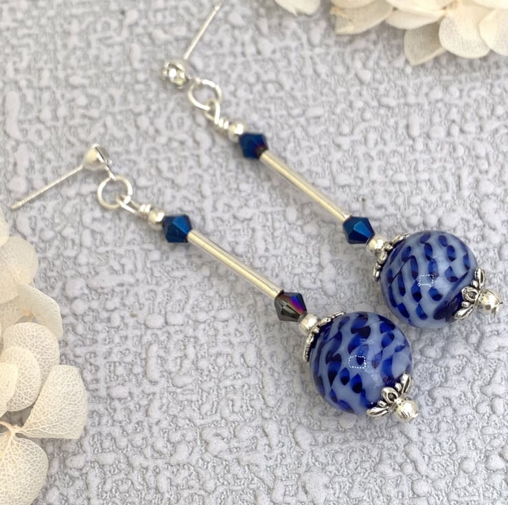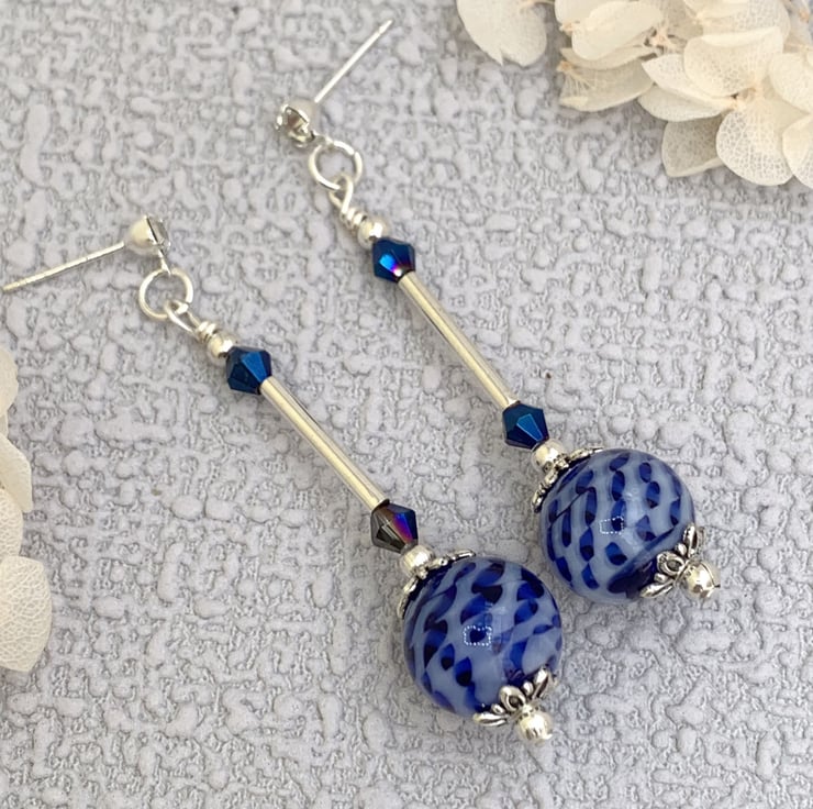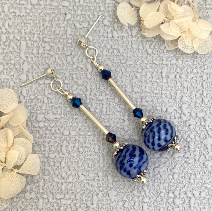 These pretty earrings are made using vintage recycled blue patterned beads as the main feature bead. The earrings also include silver-plated beads, tiny glass crystal beads, silver bugle beads and are finished with silver-plated diamante ear posts. The earrings are 5.5cm in total length.