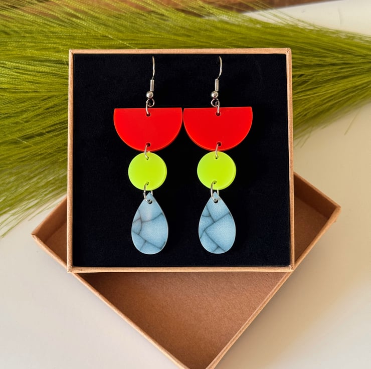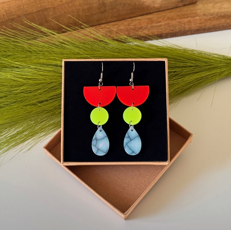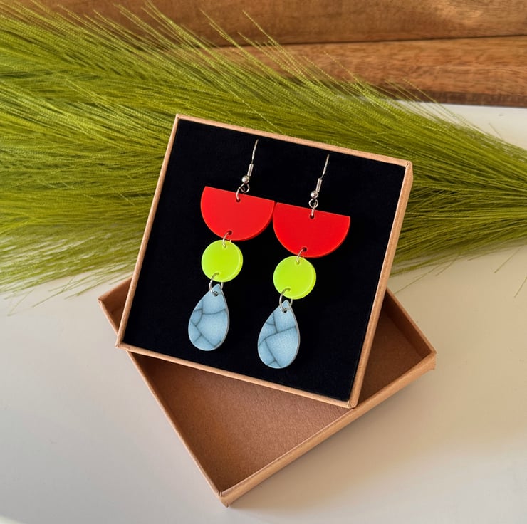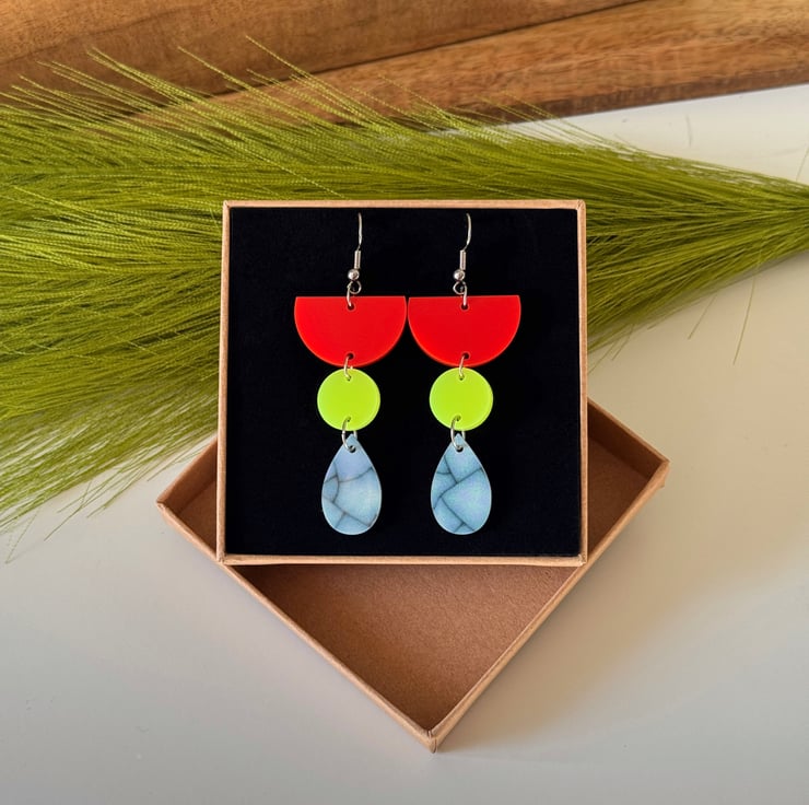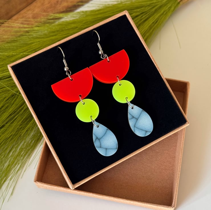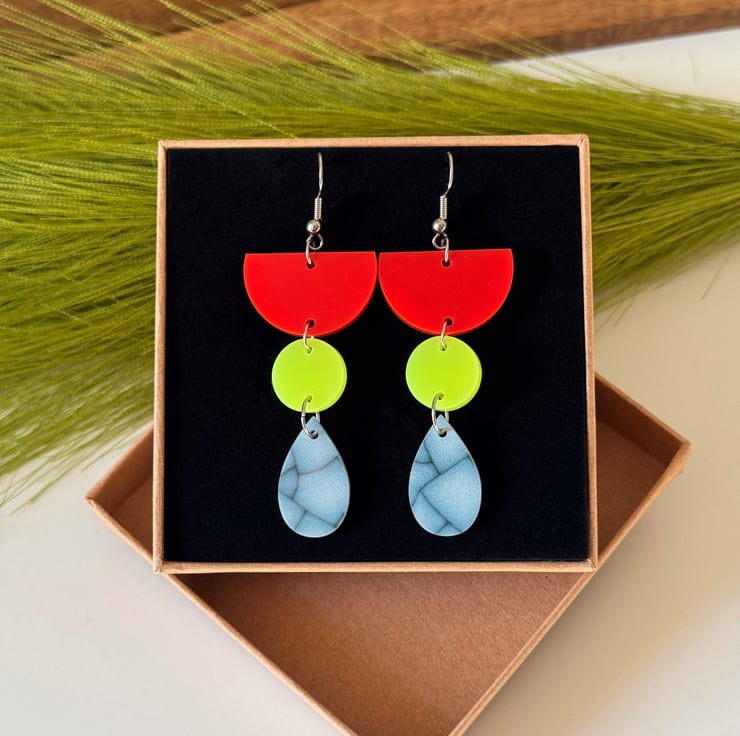 These super lightweight earrings feature a striking mix of tomato red, neon yellow and marbled blue in playful geometric shapes.