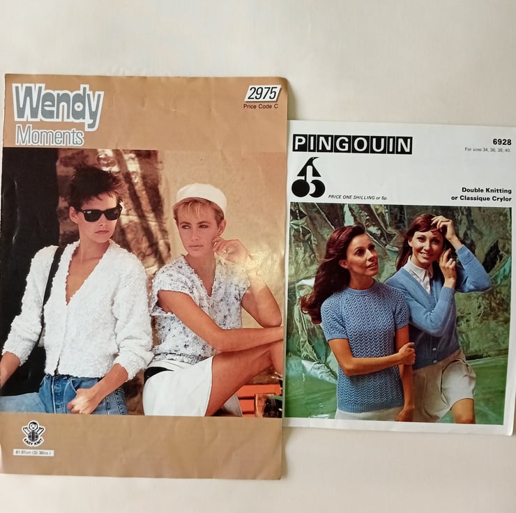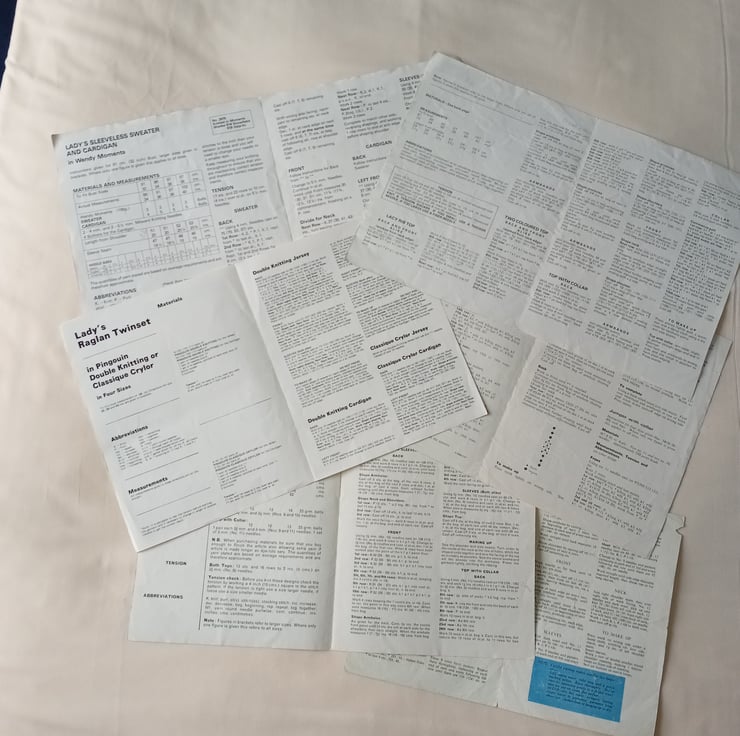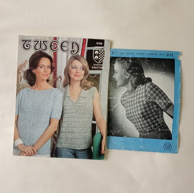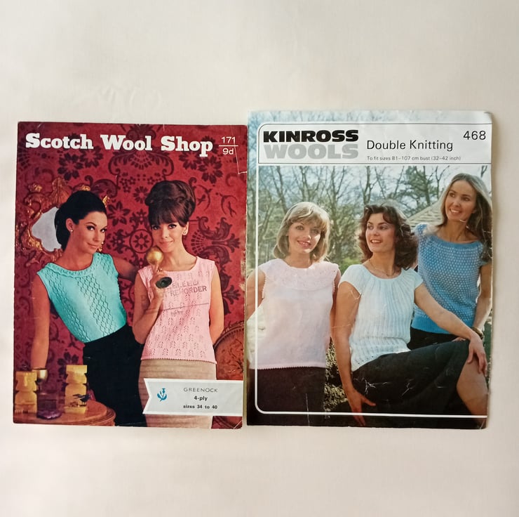 Six vintage knitting patterns, all for short sleeved ladies tops though two of them include a cardigan as well. Three of the patterns have instructions for more than one style of jumper, so altogether there are instructions for 12 garments! Some 4 ply, some double knitting, one 3 ply.