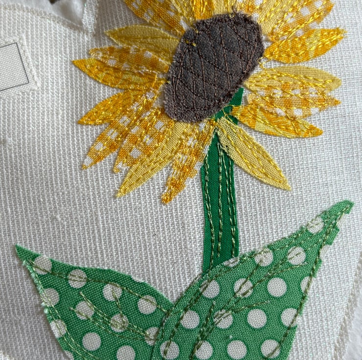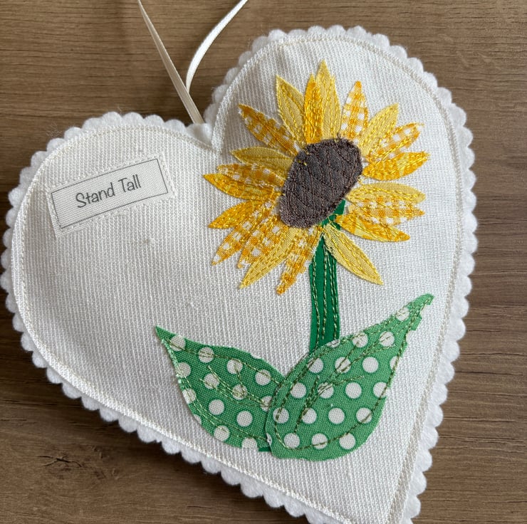 With its pretty scalloped edging this hanging heart is made from linen on a cream felt backing. The sunflower has been sewn from colourful yellow fabrics stitched on using free hand machine embroidery and the leaves and stem in vibrant greens have been added in the same way.