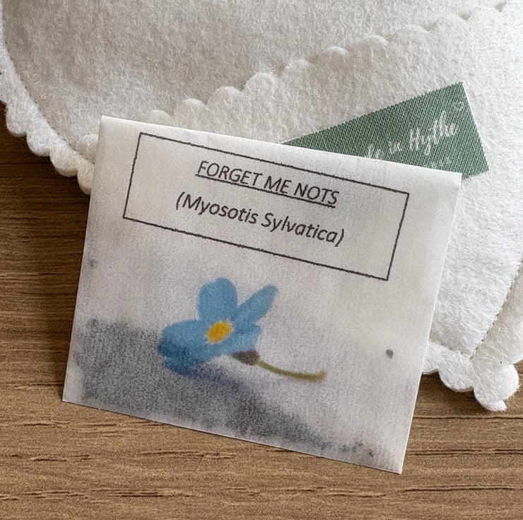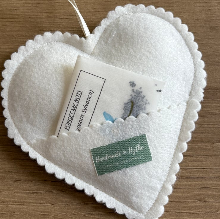 On the back of the heart there is a little pocket which contains a packet of forget-me-not seeds, ready for planting.