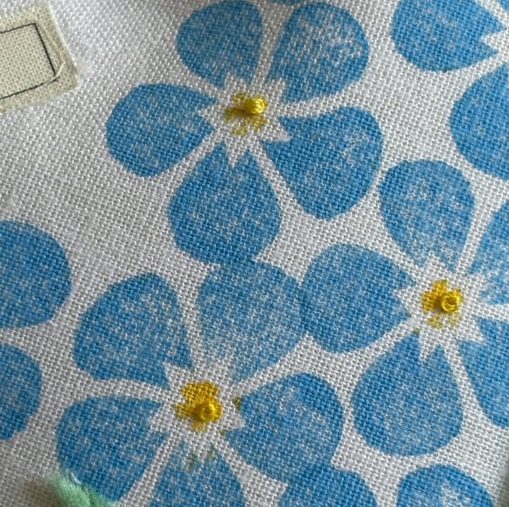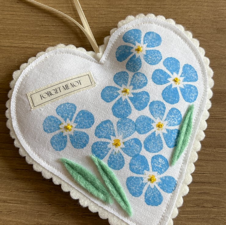 With its pretty scalloped edging this hanging heart is made from linen on a cream felt backing. The forget-me-nots have been hand printed and are finished with a little embroidered yellow centre. The leaves in subtle green felt have been machine stitched on